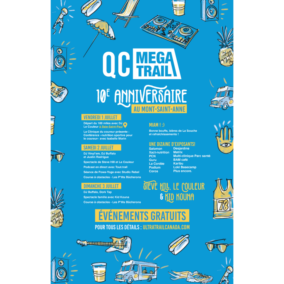 Le Québec Mega Trail est de retour cette année pour une 10e édition du 1er au 3 juillet au Mont Sainte-Anne! Cette course légendaire dite « d’ultra trail » propose plusieurs épreuves aux adeptes de course en sentiers : 100 miles (160 km), 110 km, 80 km, 50 km, 25 km, 15 km, 10 km, 6 km et 1 km. L'événement offre également une programmation gratuite conçue pour les sportifs ainsi que pour ceux qui veulent se joindre à la fête : spectacles rock et pour la famille (Steve Hill, Le Couleur formule DJ, Kid Kouna), animation avec DJ, conférences, course à obstacles, kiosques de bière et de nourriture et plus d’une douzaine d’exposants.